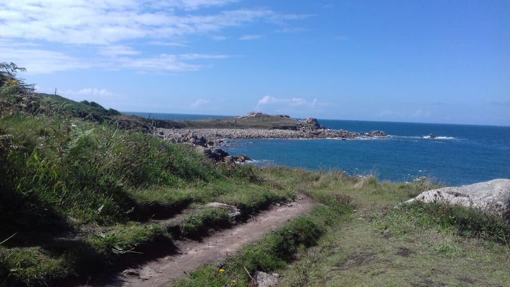 Le plus dur est d’y accéder ! Le moins pire est de prendre la direction de Port-Neuf, puis, légèrement à l’est de la ria du même nom, prendre la route du hameau de Kerfiat. Laisser la voiture où c’est possible puis traverser le hameau vers le nord en longeant un hangar (voir photo) Malgré les apparences c’est un passage public, même si la mauvaise volonté des riverains tend à faire croire le contraire. Un chemin longe un champ d’artichauts puis se termine sous une sorte de tonnelle jusqu’à la crique secrète. On se croirait dans Le Club des Cinq à l’île aux mouettes. Hormis l’accueil un peu frais, généralement plus accueillant, c’est 100% pure Breizh. La plage de Théven Braz est bien plus sableuse qu’annoncé sur les guides et les galets se cantonnent sur la droite. En revanche, la barrière rocheuse provoque pas mal de vagues à marée montante et rend la baignade très compliquée à marée basse. L’isolement complet de cette crique pourrait en faire un lieu naturiste si le GR 34 ne la longeait en amenant son flot intermittent de randonneurs. La pointe de Théven Braz, sur la droite a été un lieu d’extraction du granit. C’est un très bon endroit pour la pêche à la ligne, paraît-il. Elle est la seule plage de Cléder à être autorisée aux chiens toute l’année, sans exception.