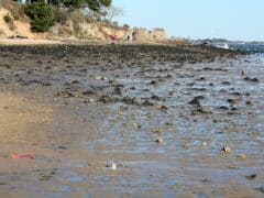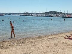 Sable. Galets. En béton. Ombrage naturel. Baignade surveillée en saison