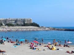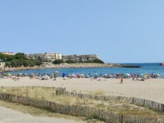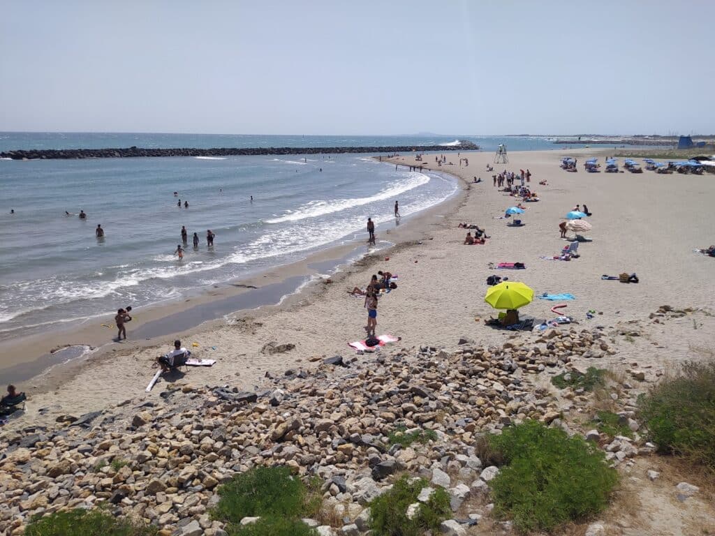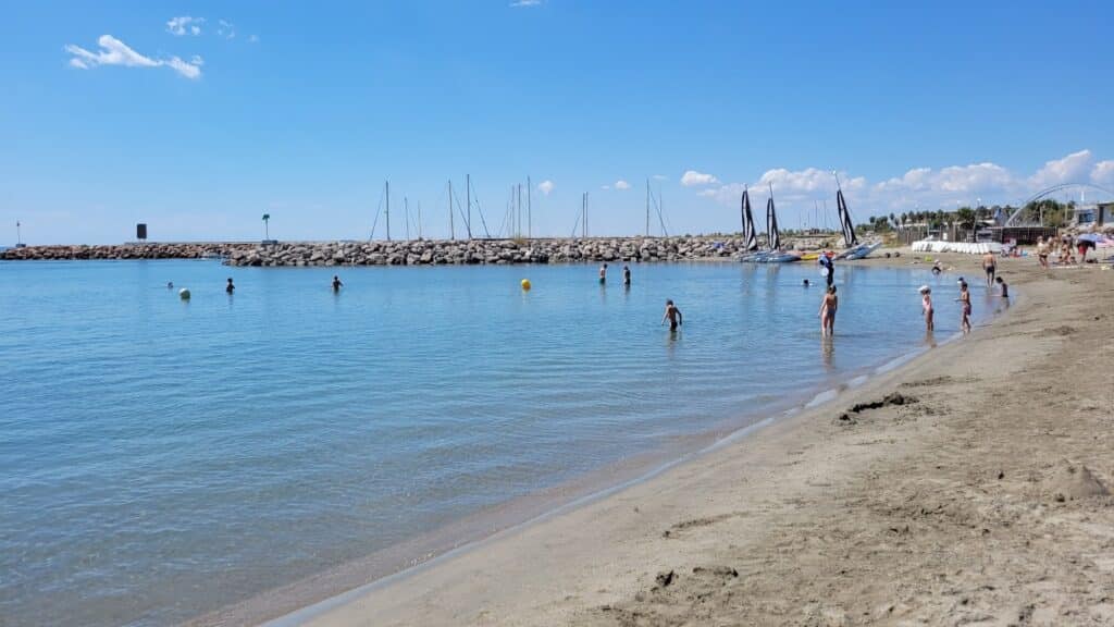 Sur la droite de cette plage, on a une zone réservée pour les sports nautiques (planche à voile et kitesurf). La délimitation se fait par une ligne d’eau (visible sur les photos – jaune et noire).