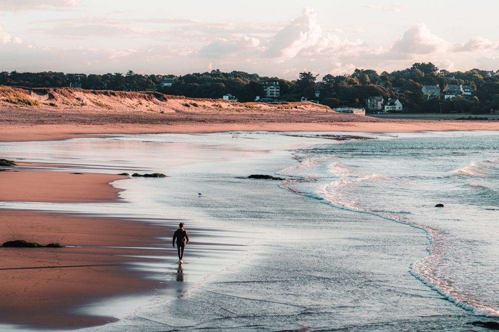 La plage de la Falaise de Guidel se trouve dans le prolongement de la plage du Bas Pouldu mais côté océan. C’est un spot de surf réputé. Par contre, il faut être prudent pour la baignade à cause de courants violents et de bancs de sable (on est à l’embouchure de la rivière Laïta, la baignade est interdite au niveau de la pointe sur la partie nord – voir plan – par contre c’est une zone de décollage pour la pratique du kitesurf). En été, la plage est surveillée dans la partie sud, il est donc conseillé de se baigner entre les drapeaux.