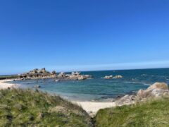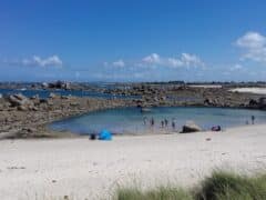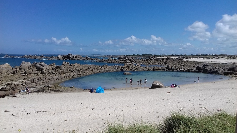Jolie plage courbe à l’est de la presqu’île des Amiets. La plage de la Grenouillère de Cléder se distingue des Amiets (la plage phare de Cléder, à 100 m), par une barrière rocheuse qui forme dans sa partie gauche, non un lagon mais une mare quasi-permanente d’origine naturelle et artificielle qui lui a probablement donné son nom. A mi-marée, cela devient une piscine très agréable pour les enfants et ça permet de ne pas avoir à chercher l’eau trop loin.