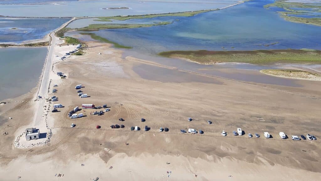 Depuis 2016, le camping est totalement interdit sur la plage. L’accès a été bloqué et un parking aménagé. Le stationnement est autorisé de 6h à 22h. N’essayez pas de venir avec votre caravane … aucune chance de rentrer … les deux seules constructions sur la plage sont le poste de secours et la cabane du club des naturistes …