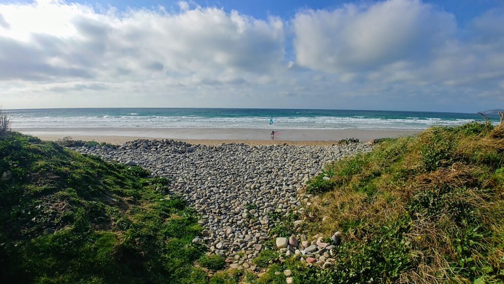 Chaussures aquatiques recommandées. Galets. Plage sauvage