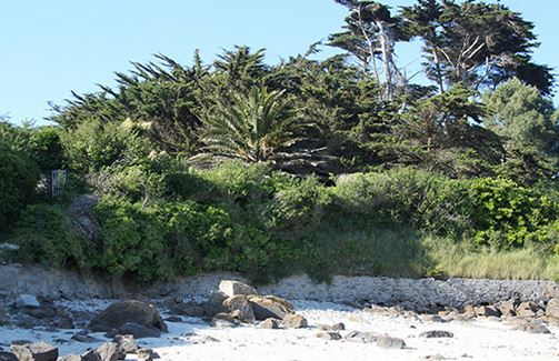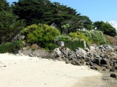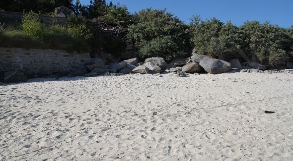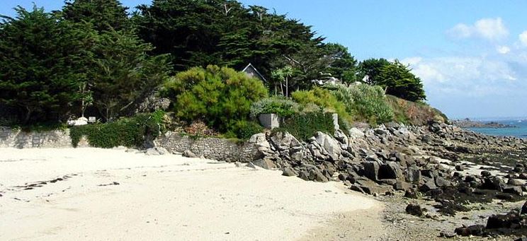 La crique d’Enez Aod Kun de l’ile de Batz est difficile à dénicher! Et de ce fait bien agréable de par l’isolement qu’elle procure. On peut passer par les plages voisines de Porz Alliou ou Porz Adelig à marée basse. Ou bien, à partir de la route Sainte Anne, il faut trouver le sentier qui y mène. On la repère au bosquet de pins et cyprès d’une propriété privée qui se détache. Elle est juste derrière. Un sentier y mène mais les habitants ne vous donneront pas spontanément l’info. Elle est en deux parties: l’une crique abritée des regards, qui autorise une certaine liberté d’action, l’autre un peu plus exposée, mais toutes deux délimitées par des rochers protecteurs. Plein sud, on y bénéficie d’un bon ensoleillement mais aussi des passages de la navette à faible distance.