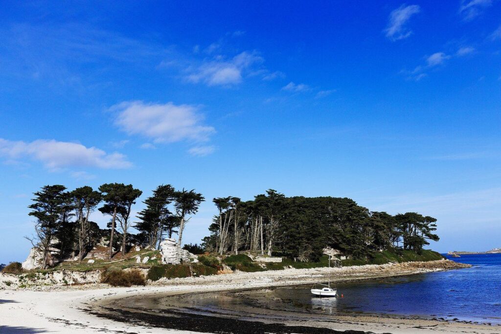 Attention, petit bijou en danger. Cette péninsule de Perharidi que se partagent les communes de Roscoff à l’est et Santec à gauche offre plusieurs plages de sable fin et un environnement sauvage seulement démenti par le centre héliomarin qui se trouve en plein milieu. Pour le préserver mieux, l’extrémité a été acquise par le Conservatoire du littoral. Mais, voulant rendre à la plage du nord-est son caractère sauvage, celui-ci a fait enlever un muret qui protégeait la plage des coups de tabac et des vagues. Résultat : le sable envahit la terre et menace de la grignoter. Ce serait dommage car on a ici l’impression d’être au bout du monde (le parking à l’entrée de la presqu’île est assez loin). Rochers, terre, sable, pins et cyprès forment un ensemble très harmonieux, loin du bruit de la civilisation.